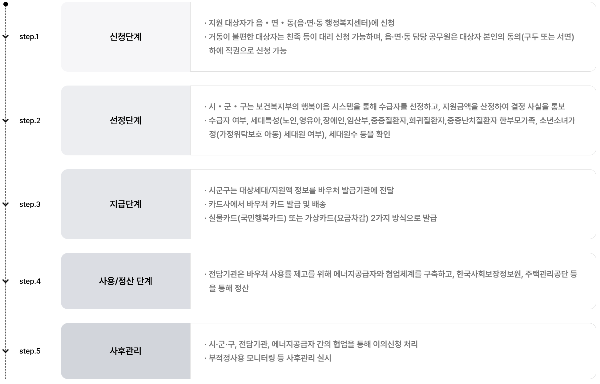 - 선정: 복지부 시스템으로 자격 심사 및 금액 산정