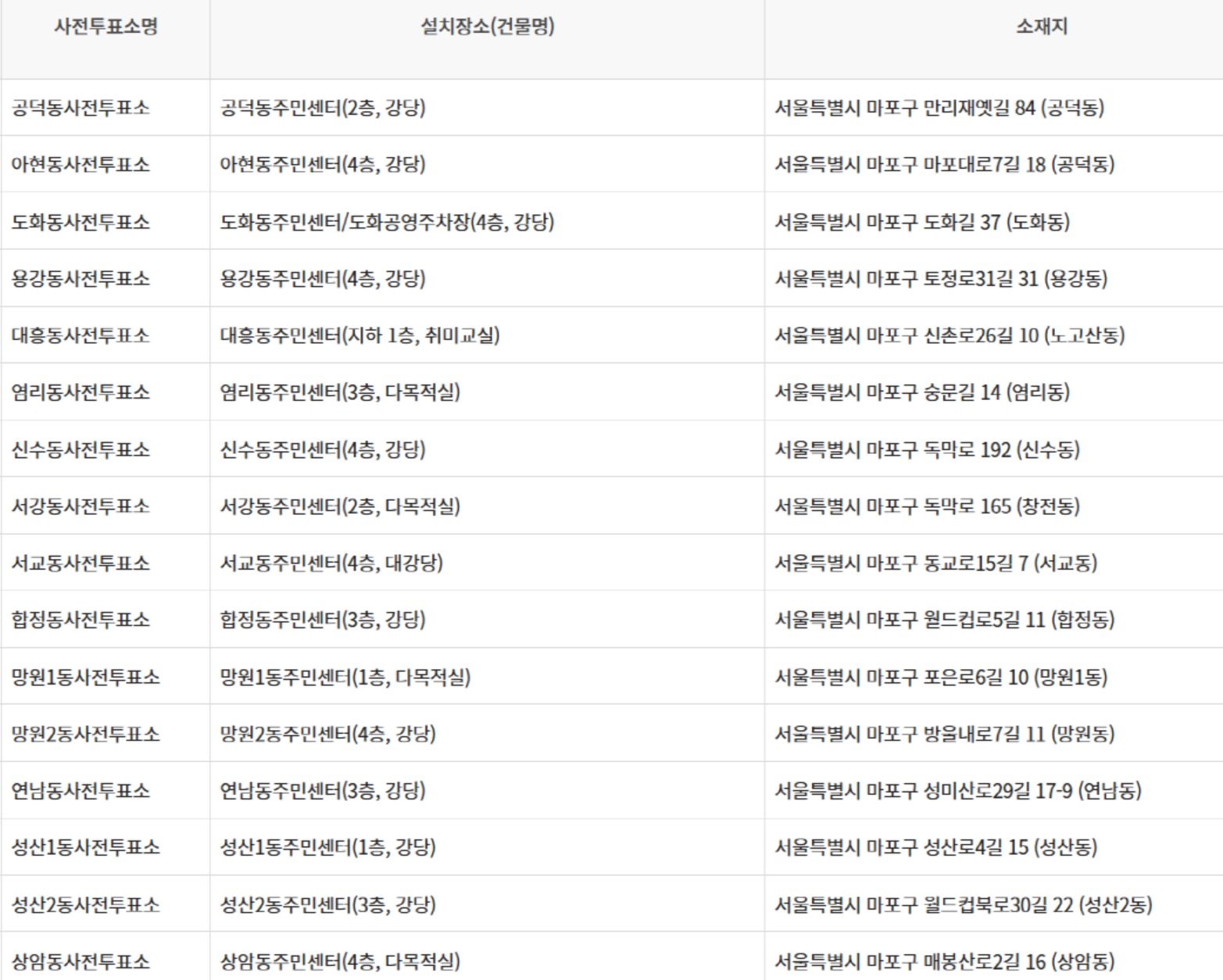 서울 마포구에 거주하거나 직장이 있는 분들은 아래의 장소 중 편한 곳을 선택해 사전투표를 할 수 있습니다. 사전투표는 주소지와 관계없이 전국 어디서든 가능하다는 점도 꼭 기억하세요!